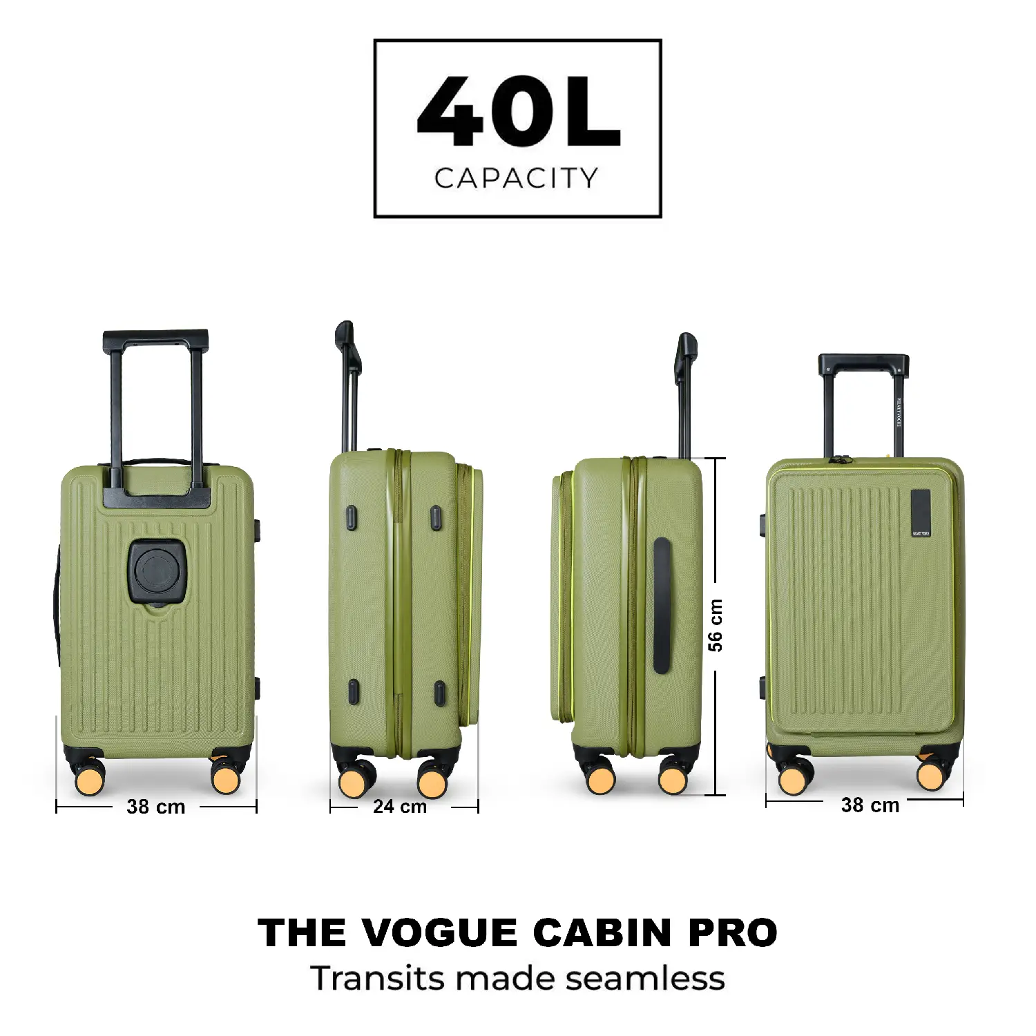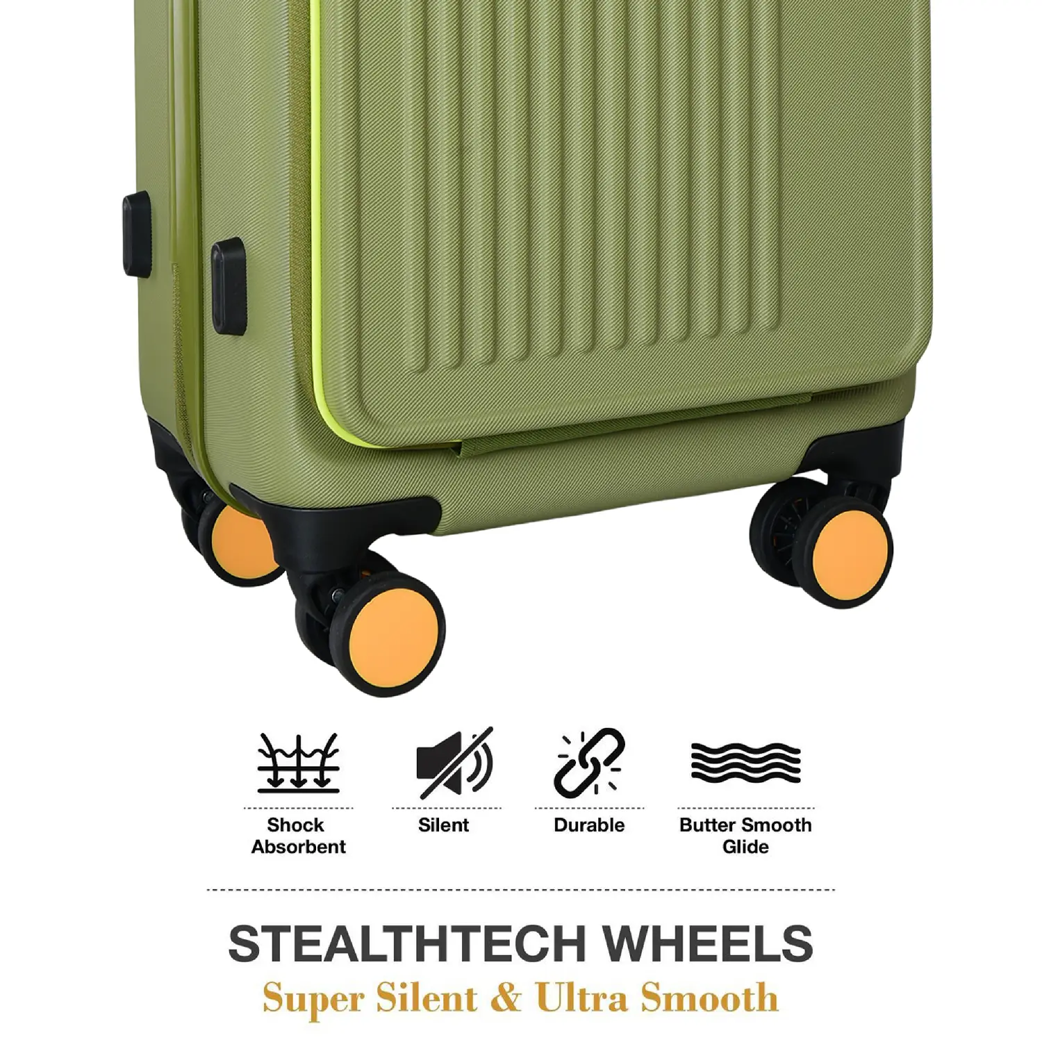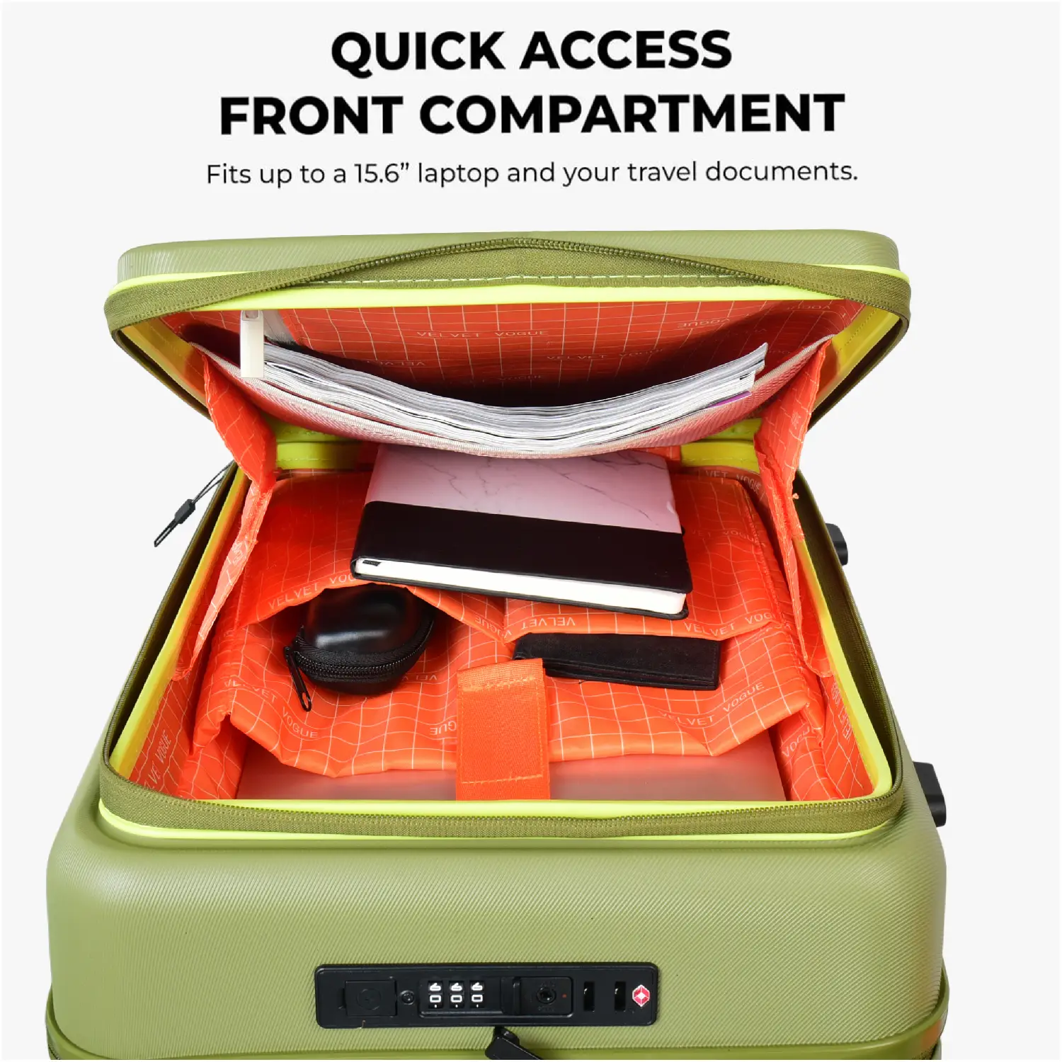 Elevate your journeys with the Amazon Green Smart Cabin Trolley. Crafted from scratch-resistant polycarbonate, this airline-approved 20-inch bag features a quick-access front sleeve for your laptop and a built-in bottle holder for convenience. Stay connected using integrated USB charging ports while gliding smoothly on 8 Japanese Hinomoto wheels. With an advanced anti-theft zipper and TSA-approved lock, your belongings stay secure, making it the ultimate solution for effortless travel.