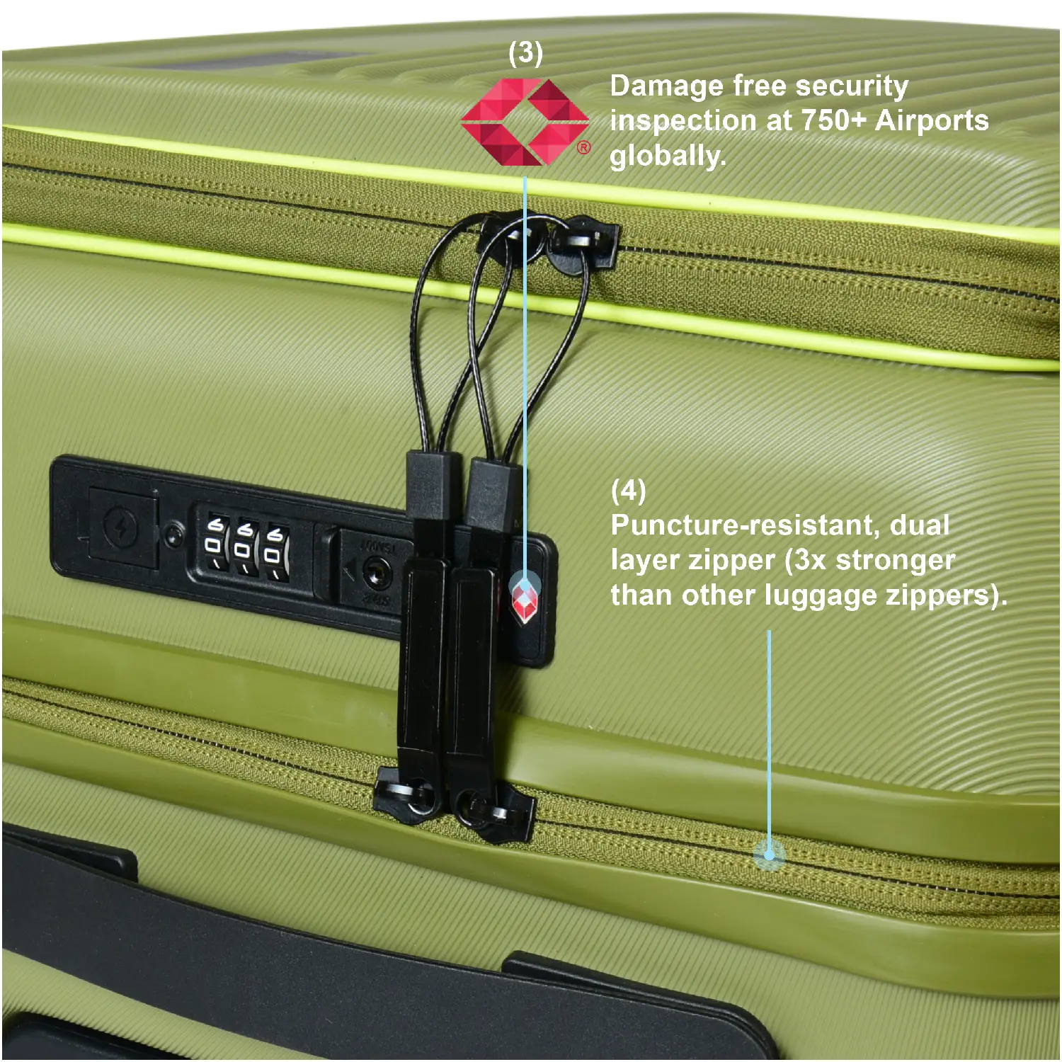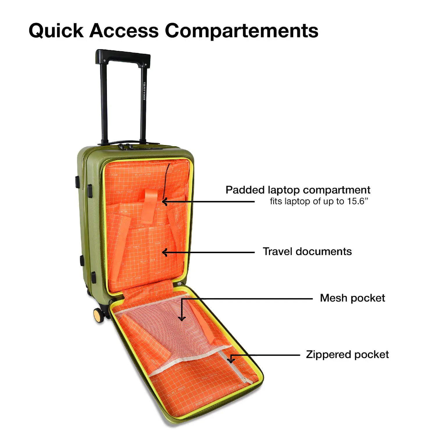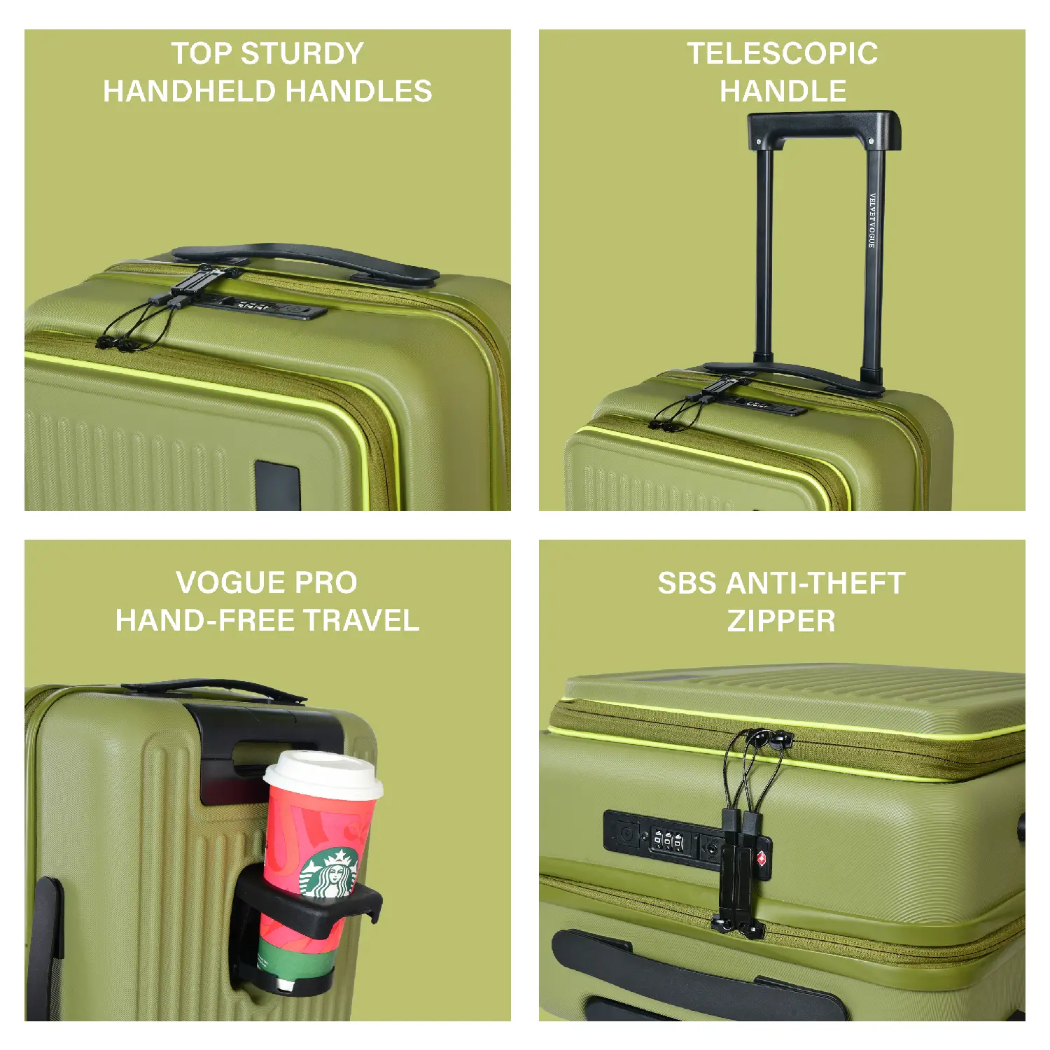 Elevate your journeys with the Amazon Green Smart Cabin Trolley. Crafted from scratch-resistant polycarbonate, this airline-approved 20-inch bag features a quick-access front sleeve for your laptop and a built-in bottle holder for convenience. Stay connected using integrated USB charging ports while gliding smoothly on 8 Japanese Hinomoto wheels. With an advanced anti-theft zipper and TSA-approved lock, your belongings stay secure, making it the ultimate solution for effortless travel.