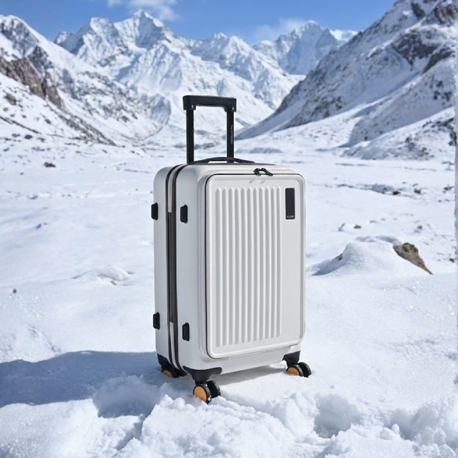 This cabin bag is crafted for the modern traveler. A quick-access front compartment keeps your laptop and essentials within reach, while an exclusive built-in bottle holder ensures you stay hydrated. For security, it features an advanced anti-theft zipper and a TSA-approved lock. Stay connected with dual USB charging ports. Made from a durable, water-resistant Polycarbonate Hard Shell, this lightweight bag is built for effortless movement with 8 smooth Japanese Hinomoto 360° spinner wheels and a premium aluminum handle. Available in Amazon Green and Himalayan Snow, this bag is a symbol of secure, stylish, and effortless travel.