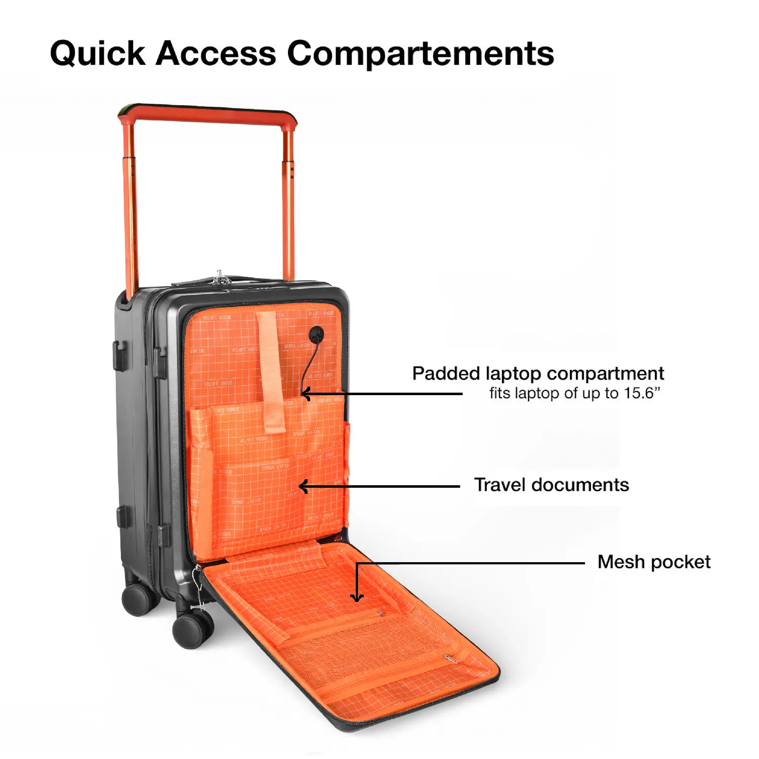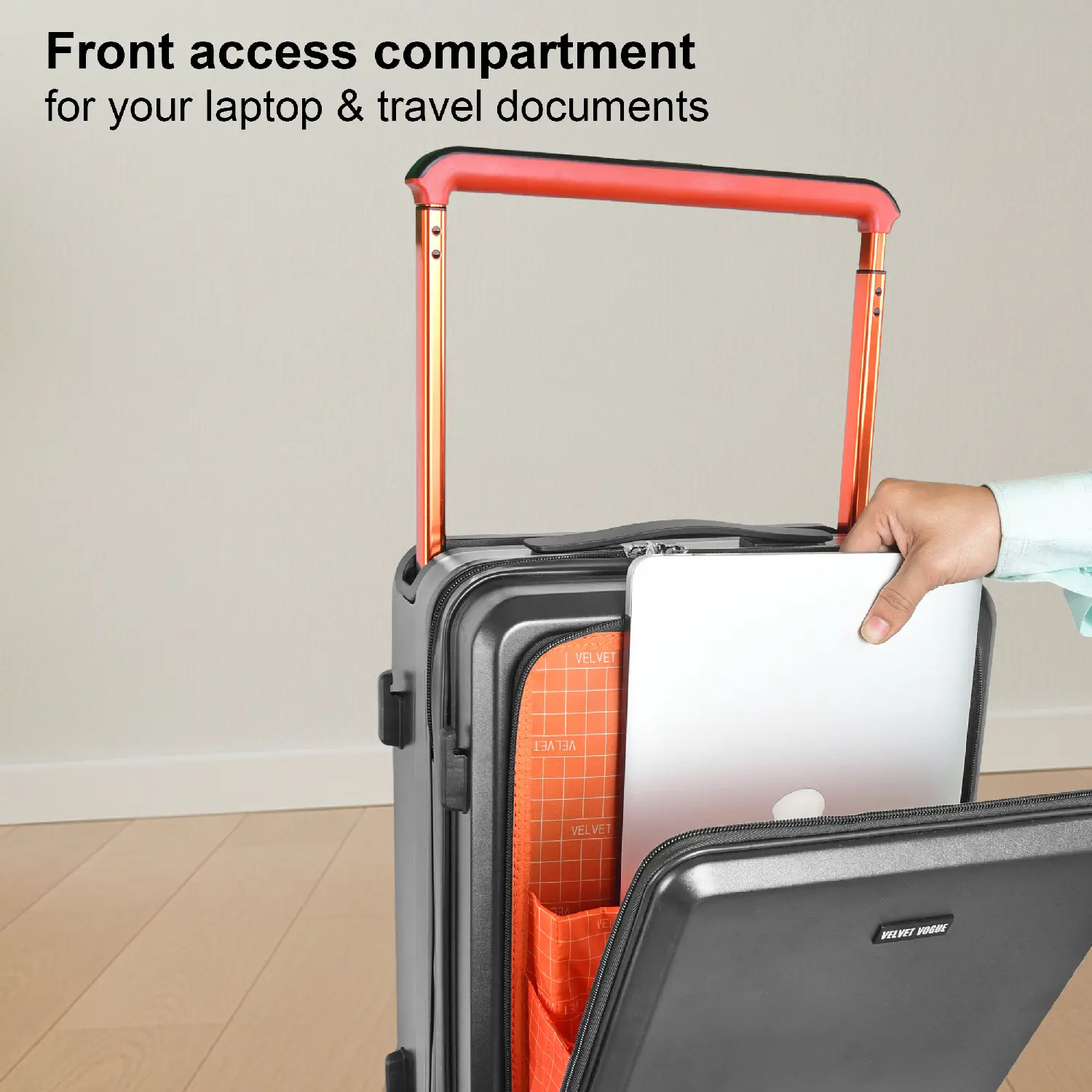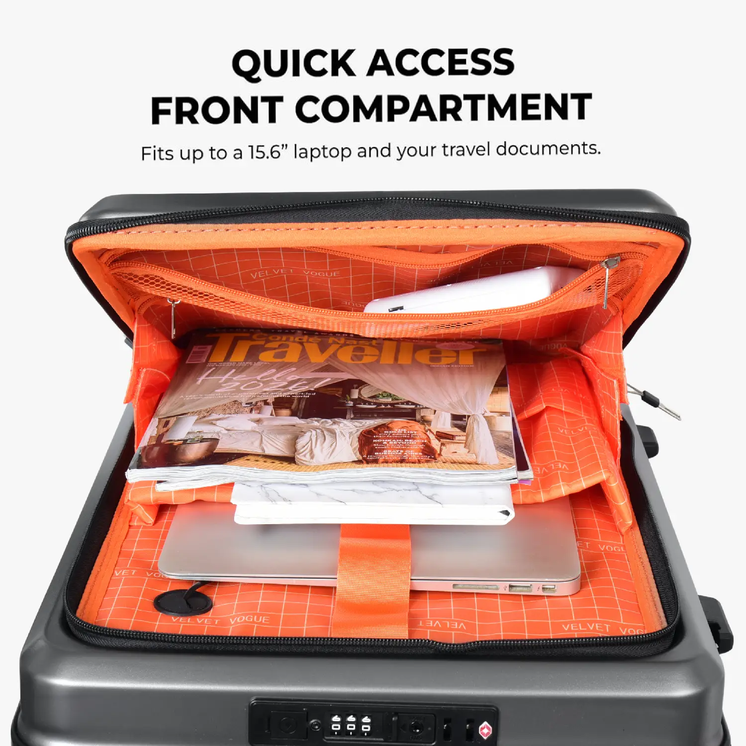 Front Laptop Compartment – Dedicated padded space for 15.6-inch laptop and tablet access during travel.